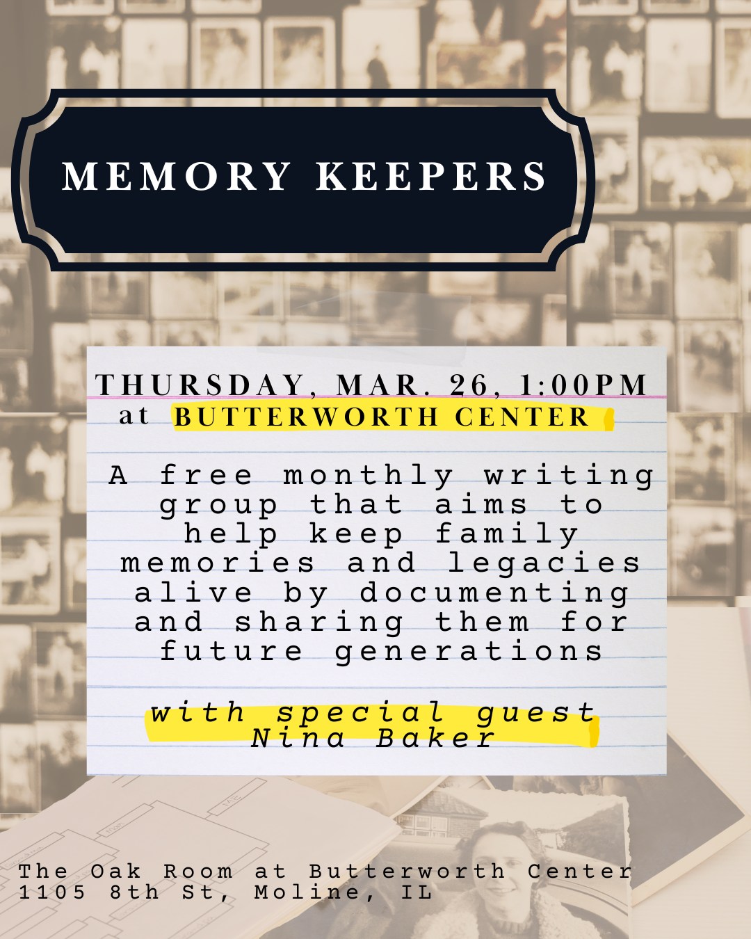 One of the greatest gifts you can give to your children and future generations is to keep your family stories alive. Please join our new Memory Keepers Group as we come together with a common interest and goal to preserve our family stories through the written word.