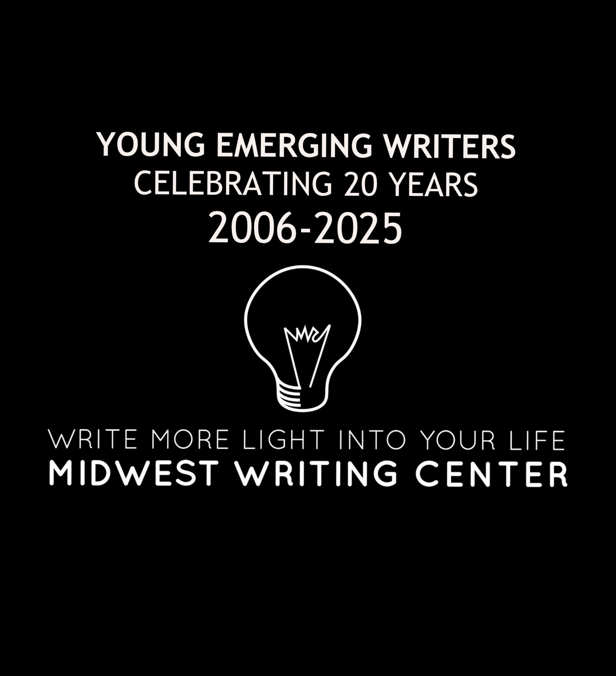 To celebrate the 20th anniversary of Young Emerging Writers, we printed some limited edition t-shirts! The design was done by YEW 2025 Editorial Fellow Lyn Kress, who asked the YEW 2025 interns and staff to sketch on a large notepad and then took those sketches and arranged them into this terrific design! Many thanks to Lyn & tony Johnson for handing the printing.